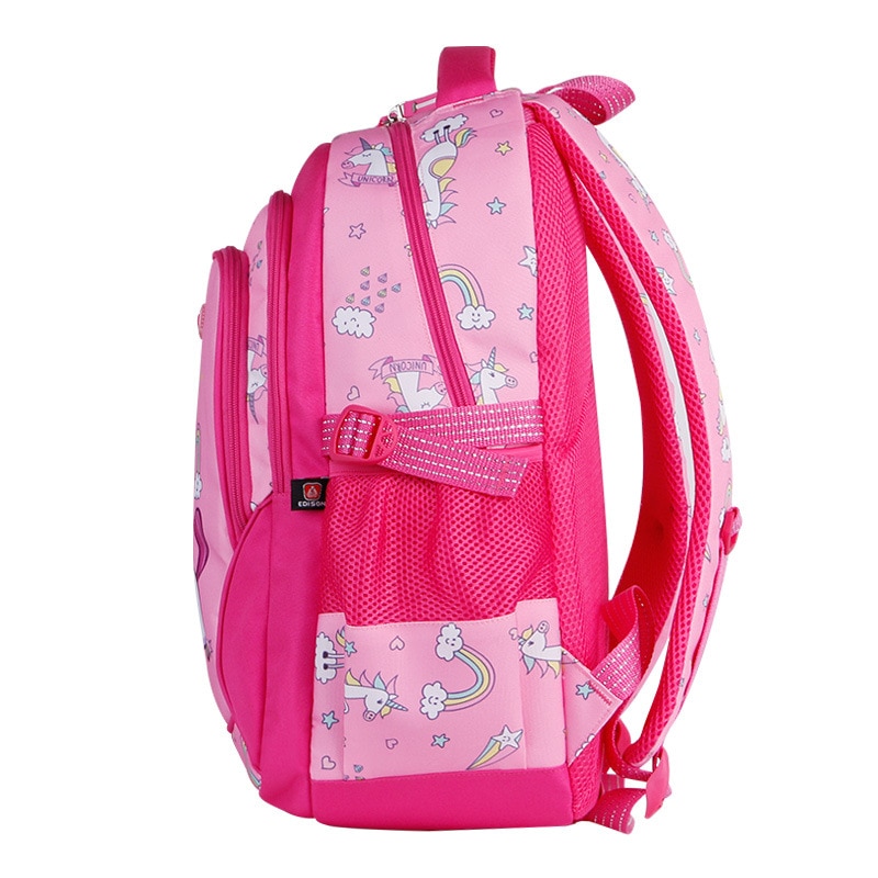 De zachte, vrouwelijke roze kleur van de tas wordt versterkt door schattige, kleurrijke eenhoornmotieven. Elk detail is zorgvuldig bedacht om de verbeelding van kleine meisjes te vangen, met dansende eenhoorns, fonkelende regenbogen en twinkelende sterren.