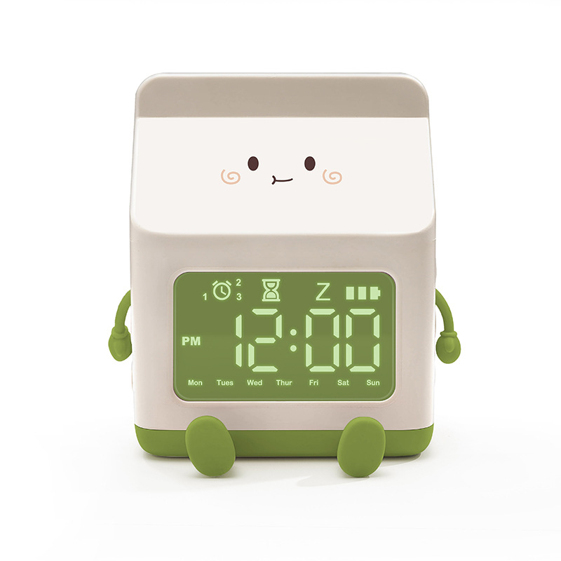 De vorm van het melkpak geeft het een leuke en unieke uitstraling. Het heeft een helder LED-display dat de tijd duidelijk weergeeft en gemakkelijk af te lezen is, zelfs in het donker.