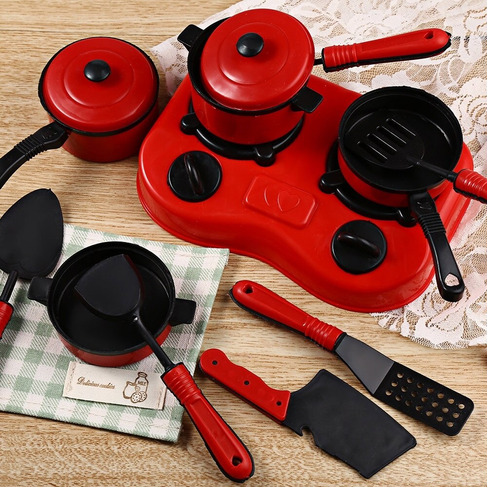 11-delige keukenset voor meisjes, compleet in zwart en rood.
