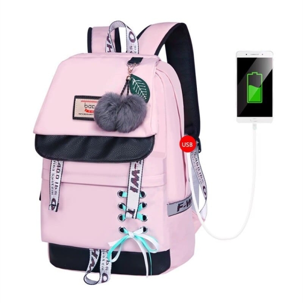 Schattige, modieuze roze rugzak in Koreaanse stijl voor meisjes met een blauwe sleutelhanger
