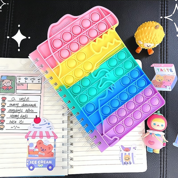 Dit notitieboekje is voorzien van pop-it technologie, die bestaat uit een reeks siliconen bubbels die op elke pagina zijn gerangschikt. De bellen voelen zacht aan en voelen heerlijk aan als erin geknepen wordt. Ze produceren ook een bevredigend zacht “pop”-geluid, wat een leuke dimensie aan de speelervaring toevoegt.
